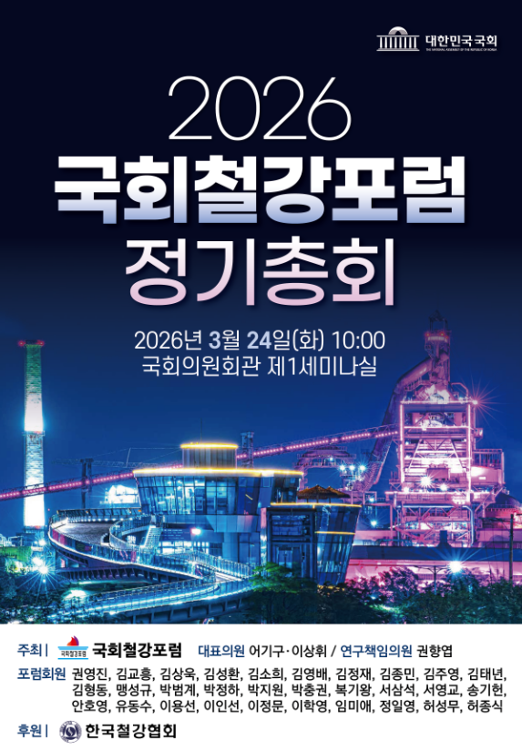 국회에 따르면 오는 3월 24일 오전 10시, 국회의원회관 제1세미나실에서 2026 국회철강포럼 정기총회가 개최된다. 6회째 정기총회를 개최하는 국회철강포럼은 통상적으로 총회에서 연구포럼 조직 및 운영안, 연구활동세부계획 등을 논의 및 의결하고 한 해 포럼 중점 이슈를 발굴 및 소통하는 시간을 가진다.