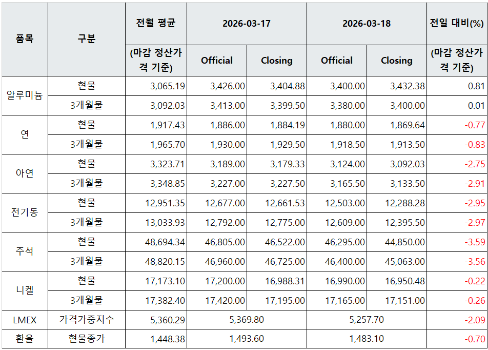 김영은 기자 yekim@snmnews.com 다른 기사 보기 관련기사 [표] LME 비철금속 및 환율 동향(3월 17일) [표] LME 비철금속 및 환율 동향(3월 16일) [표] LME 비철금속 및 환율 동향(3월 19일) 저작권자 © 철강금속신문 무단전재 및 재배포 금지