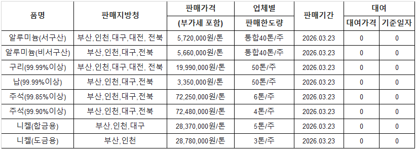 김영은 기자 yekim@snmnews.com 다른 기사 보기 관련기사 [표] 조달청 방출 가격(3월 24일) [표] 조달청 방출 가격(3월 25일) 저작권자 © 철강금속신문 무단전재 및 재배포 금지