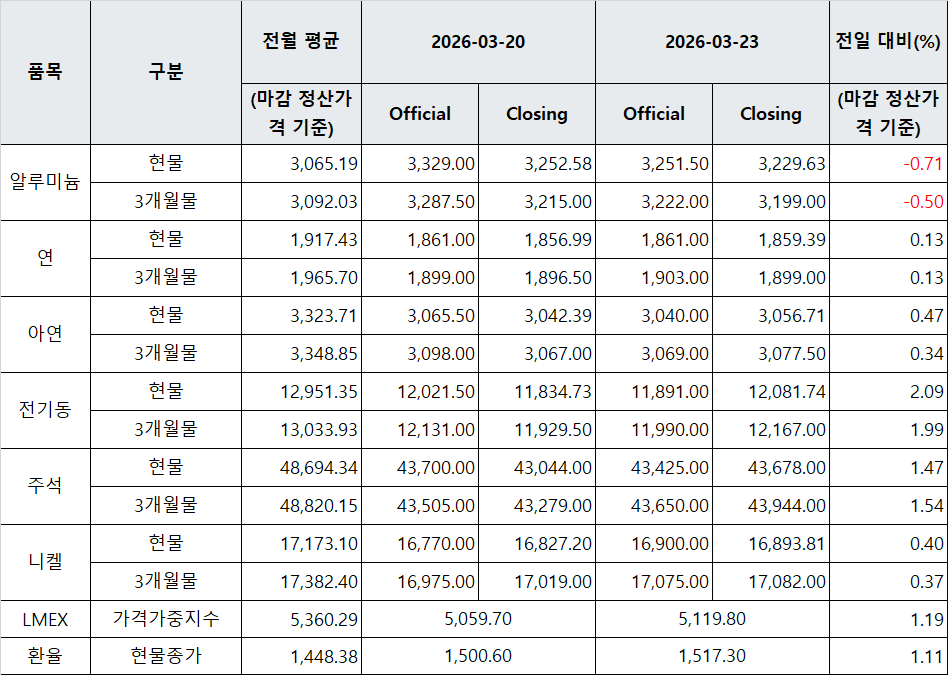 김영은 기자 yekim@snmnews.com 다른 기사 보기 관련기사 [표] LME 비철금속 및 환율 동향(3월 20일) [표] LME 비철금속 및 환율 동향(3월 19일) [표] LME 비철금속 및 환율 동향(3월 24일) 저작권자 © 철강금속신문 무단전재 및 재배포 금지