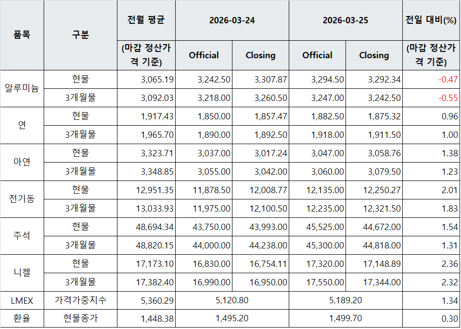 김영은 기자 yekim@snmnews.com 다른 기사 보기 관련기사 [표] LME 비철금속 및 환율 동향(3월 26일) [표] LME 비철금속 및 환율 동향(3월 27일) 저작권자 © 철강금속신문 무단전재 및 재배포 금지