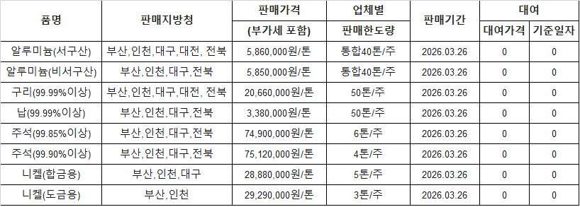 김영은 기자 yekim@snmnews.com 다른 기사 보기 관련기사 [표] 조달청 방출 가격(3월 27일) [표] 조달청 방출 가격(3월 30일) 저작권자 © 철강금속신문 무단전재 및 재배포 금지