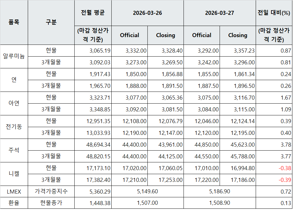 김영은 기자 yekim@snmnews.com 다른 기사 보기 관련기사 [표] LME 비철금속 및 환율 동향(3월 26일) [표] LME 비철금속 및 환율 동향(3월 25일) [표] LME 비철금속 및 환율 동향(3월 30일) 저작권자 © 철강금속신문 무단전재 및 재배포 금지