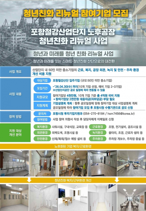 포항시가 철강산업단지 내 노후 공장 환경 개선을 위한 ‘청년친화 리뉴얼 사업’ 참여기업을 모집한다.
