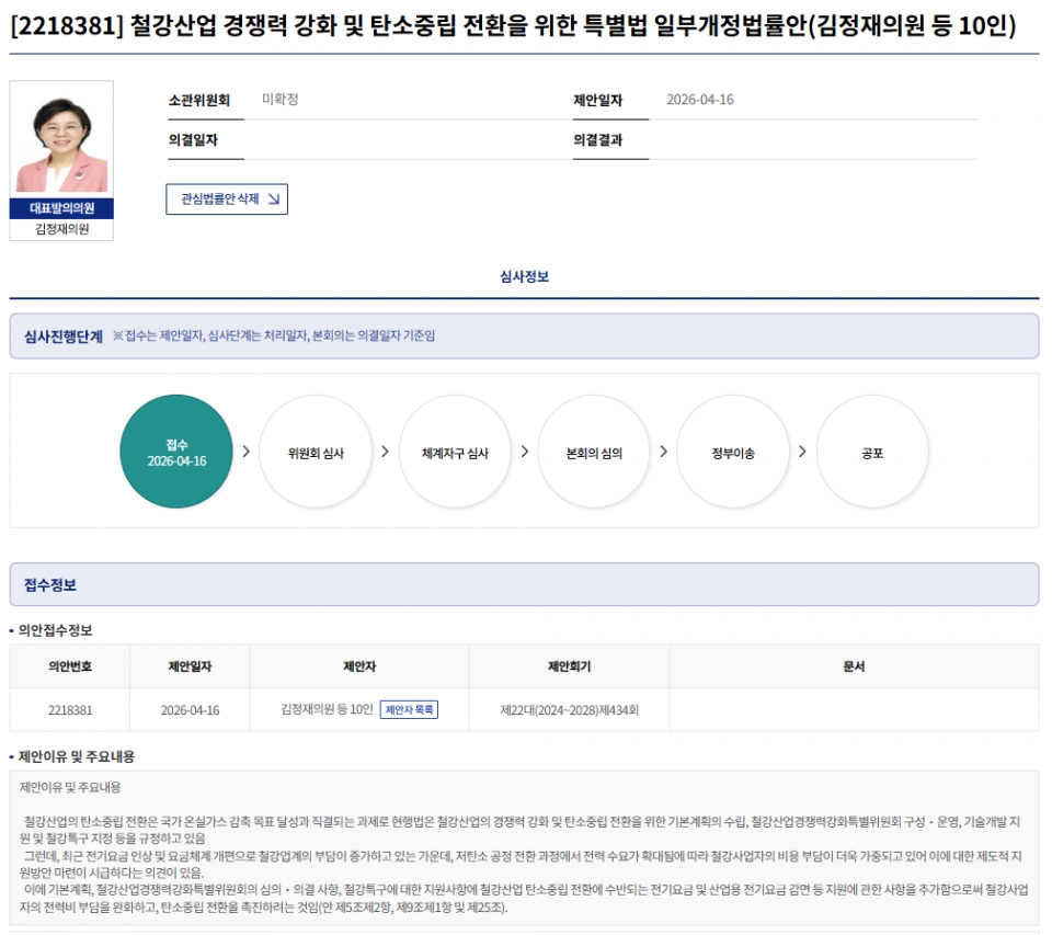 개정안 대표 발의자인 김정재 의원은 법안 발의일인 16일, 자신의 페이스북(SNS)를 통해 “지난 전기사업법 개정안에 이은 철강산업 전기요금 부담 완화를 위한 후속 입법을 냈다. 철강산업은 대한민국 제조업의 근간이자 포항 경제의 핵심 산업이지만, 전기요금 부담과 탄소중립 전환이라는 이중 과제 앞에서 현장의 어려움은 갈수록 커지고 있다”라며 “이번 개정안은 철강산업의 전기요금 부담 완화 지원 근거를 마련하고, 보다 체계적인 지원 기반을 구축하기 위한 것으로, 철강산업이 어려움을 극복하고 다시 도약할 수 있도록, 정책 지원에 최선을 다하겠다”고 밝혔다.