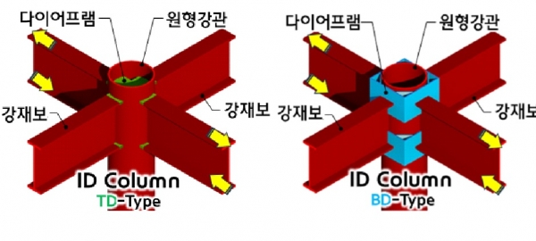 이번 인증은 ‘부분 관통형 다이아프램(TD-Type)’과 ‘박스형 다이아프램(BD-Type)’을 적용한 중간모멘트골조 내진접합부 설계 방법 및 기술 지침에 관한 것이다. 3사는 공동 연구를 통해 보춤 800mm 이하인 H형강보와 ID-Column 콘크리트충전강관(CFT) 기둥으로 구성된 접합부의 성능을 검증하고 최종 인증을 획득했다. TD-Type(Through Diaphragm)은 기둥 내부에 관통 다이아프램을 적용해 보와의 접합 시응력 전달의 명확성과 견고성을 극대화했다. 이어 BD-Type(Box-shaped Diaphragm)은 기둥 외부 박스형 다이아프램을 통해 접합부의 신뢰성을 향상시키고 제작 편의성을 높였다.