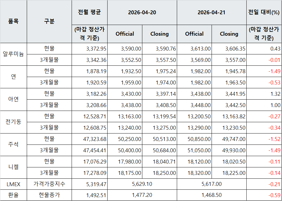 [표] LME 비철금속 및 환율 동향(4월 21일)