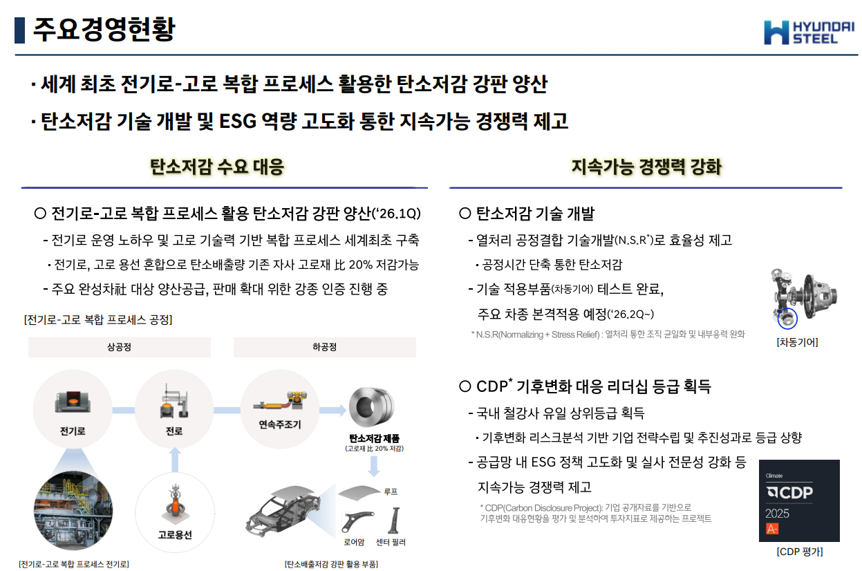 또한, 현대제철은 세계 최초로 '전기로-고로 복합 프로세스'를 가동하며 탄소저감 강판 생산을 본격화하는 등 친환경 철강 시장의 리더십 확보에 나섰다.