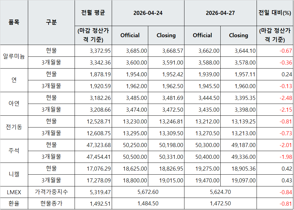 [표] LME 비철금속 및 환율 동향(4월 27일)