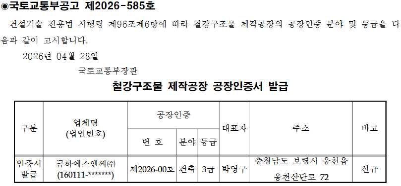 금하에스앤씨가 국토교통부로부터 철강구조물 제작공장 건축 3급 공장인증서를 발급받았다. 건축 3급부터는 철강건축물 공공발주 및 입찰 자격이 확대된다.