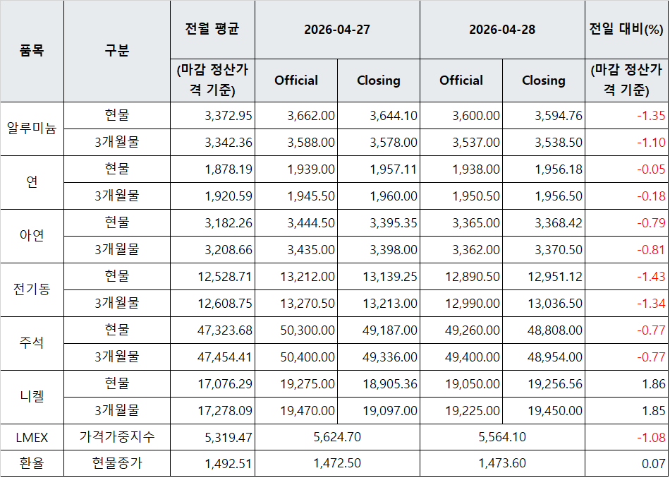[표] LME 비철금속 및 환율 동향(4월 28일)