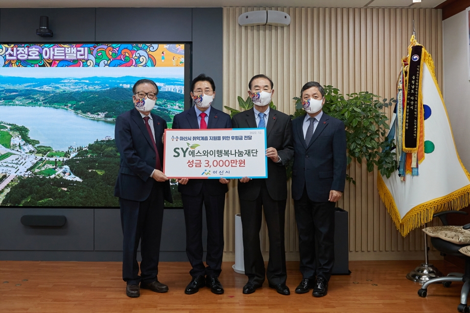 8일 에스와이에 따르면 에스와이 행복재단은 지난 6일 아산시를 방문해 아산시 취약계층 지원을 위한 후원금 3,000만원을 전달했다.