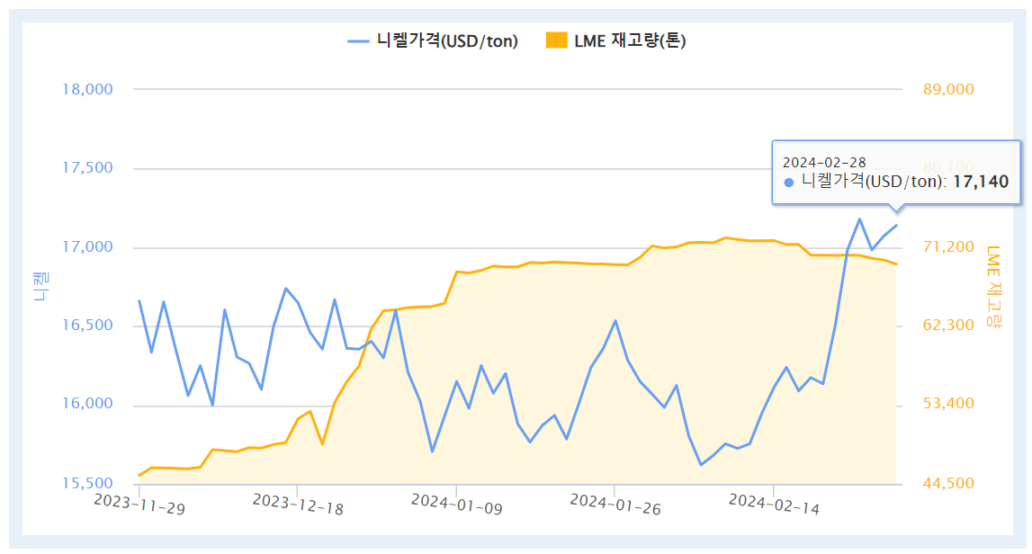 그동안 저품위 니켈은 스테인리스스틸, 고품위 니켈은 배터리 제조에 주로 사용되었는데, 저가의 저품위 니켈공급 속 정제련 기술 발전으로 니켈 시장이 전환점을 맞이했기 때문이다. 특히 저가의 인도네시아산 니켈 공급 확대로 LME 니켈 가격은 지난해 2월에 톤 당 2만5,860달러에서 올해 2월에는 최저 1만5,620달러까지 떨어지며 1년 새 40%가량 하락했다.