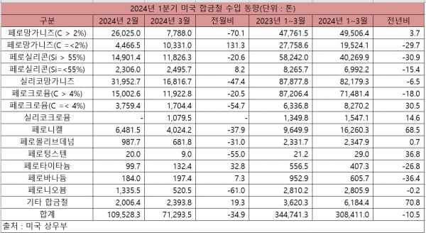 미국 상무부 자료에 따르면 2024년 1분기 누적 기준 합금철 수입은 30만8,411.0톤으로 전년 동기 대비 10.5% 감소했다. 1분기 수입 증가는 제조업과 주택시장 경기 부진에 따른 조강 생산 감소로 인해 미국 내 합금철 수요가 감소한 데다 일부는 자국 생산이 확대된 것에 기인한 것이다. 특히, 중국산 의존도가 높던 망가니즈와 실리콘 계열 합금철 수입이 큰 폭으로 감소하여 실제 수요 감소보다는 공급망 재편에 따른 영향이 더욱 큰 것으로 풀이된다.
