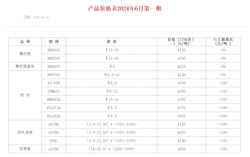 사강그룹은 6월 초순(1~10일) 봉강류 제품 가격을 톤당 50~100위안씩 인상한다고 밝혔다.
