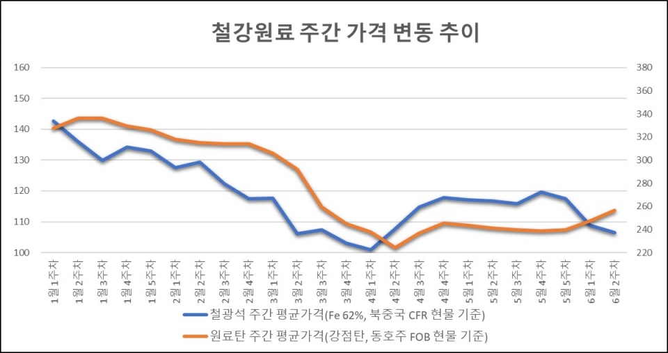 산업통상자원부 통계에 따르면 6월 10일~6월 14일 기준 철광석 평균 가격은 톤당 106.49달러(Fe 62%, 북중국 CFR 현물 기준)를 기록해 직전 주간 대비 톤당 2.31달러 하락했다. 이에 철광석 가격은 주간 기준으로 3주 연속 하락한 모습이며 고점 대비 13.06달러 낮은 수준을 나타내고 있다.