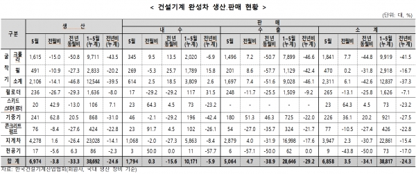 이처럼 국내는 물론 주요 수출국 시장도 모두 부진한 탓에 5월 누적 기준으로도 건설기계 완성차 생산 및 판매는 각 3만8,692대, 3만8,817대로 전년 동기 대비 24.6, 24.3% 감소했고, 내수판매와 수출 또한 각 10,171대, 2만8,646대로 전년 동기 대비 5.9%, 29.2% 감소했다.