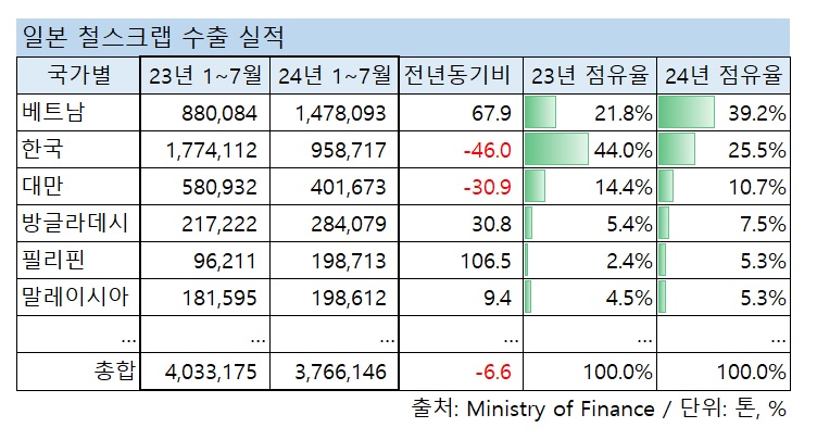 이에 따라 1~7월 일본 철스크랩 수출은 376만6,000톤으로 전년 동기 대비 6.6% 감소한 것으로 나타났다.