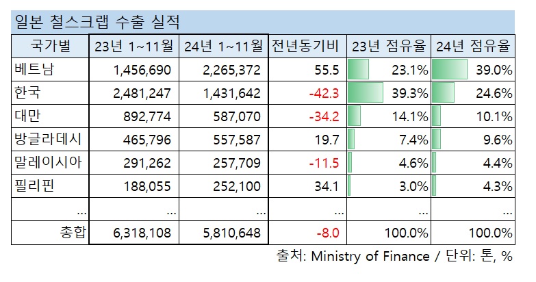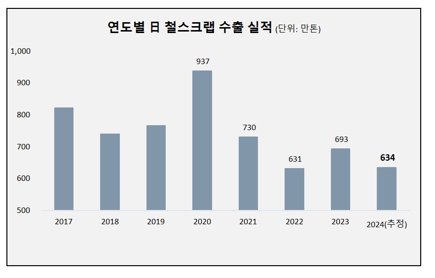 2019년까지 700만톤 안팎을 유지하던 일본 철스크랩 수출은 2020년 937만톤으로 급증하며 2009년(940만톤)에 이어 역대 최대 수준을 기록한 바 있으나, 이후 다시 급감하면서 2022년 631만톤으로 쪼그라들었다. 당시 수출 실적은 2011년(544만톤) 이후 11년 만에 최저치다.