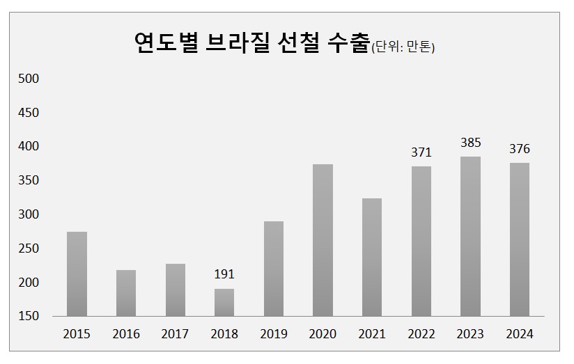 브라질 선철 수출은 2018년(191만톤)을 저점으로 2020년(374만톤) 크게 오른 뒤 5년 연속 300만톤대를 유지하고 있다. 2021년(324만톤)에는 소폭 주춤했으나 주요 선철 수출국이었던 러시아와 우크라이나 전쟁 여파로 반사이익과 함께 2022년부터 3년 연속 300만톤 중후반대를 이어가는 모습이다.