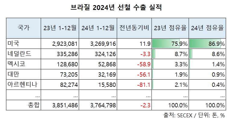최대 수출처 미국향 증가에도 그 외 국가에서 일제히 감소하면서 전체 실적도 주춤해진 양상이다. 지난해 국가별 수출은 미국향이 327만톤으로 전년 대비 11.9% 증가했으나, 네덜란드향(32만4,000톤)과 멕시코향(5만,3000톤)이 각각 3.3%, 58.9% 감소했다.