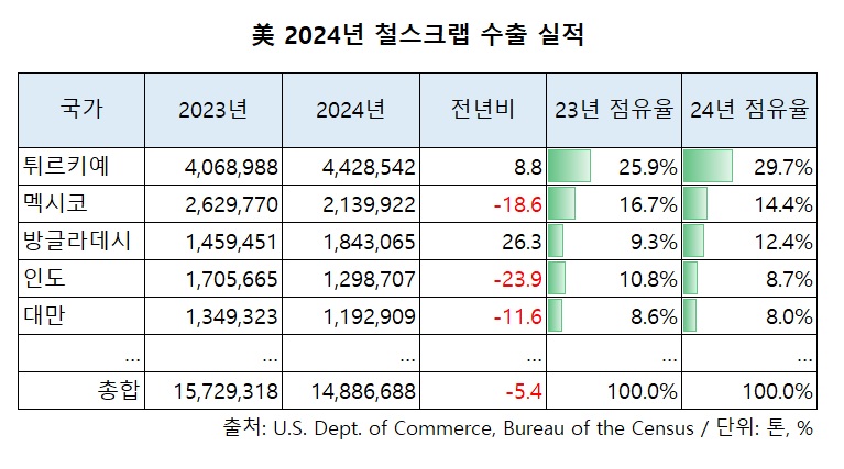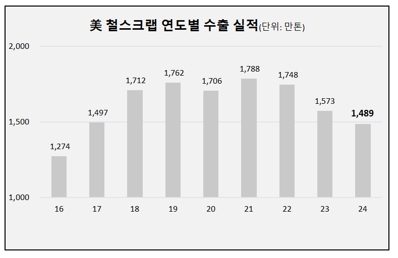 미국 철스크랩 총수출은 2018년부터 2022년까지 5년 연속 1,700만톤대를 유지했으나 2023년부터 1,500만톤대로 급격히 내려앉았다. 2021년 1,788만톤을 고점으로 △2022년 1,748만톤 △2023년 1,573만톤에 이어 3년 연속 감소세다.